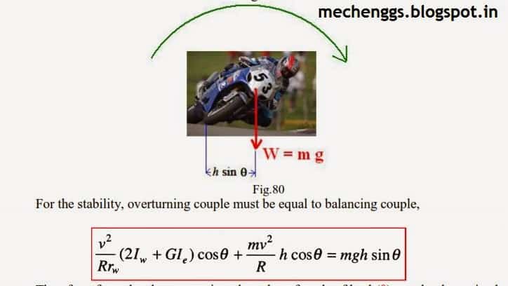 A vehicle running on the road is said to be stable when no wheel is supposed to leave the road surface. In other words, the resultant reactions by the road surface on wheels should act in upward direction. For a moving vehicle, one of the reaction is due to gyroscopic couple produced by the rotating wheels and rotating parts of the engine. Let us discuss stability of two and four wheeled vehicles when negotiating a curve/turn.
