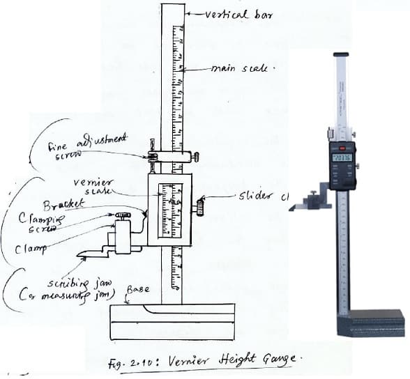 - Vernier Height Cauge类似于Vernier Caliper,而是在该仪器中,刻度杆保持在垂直位置,并且与表面板结合使用。游标高度计是用于确定某物的高度或用于重复标记要工作的物品的测量装置。指针锐化以允许它充当划线车并有助于标记工件。下图显示了游标高度仪表的细节和工作布置。